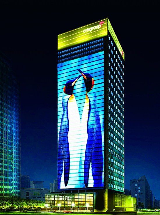 方大承建的全球最大的LED全彩顯示屏——上海花旗銀行LED彩顯幕墻