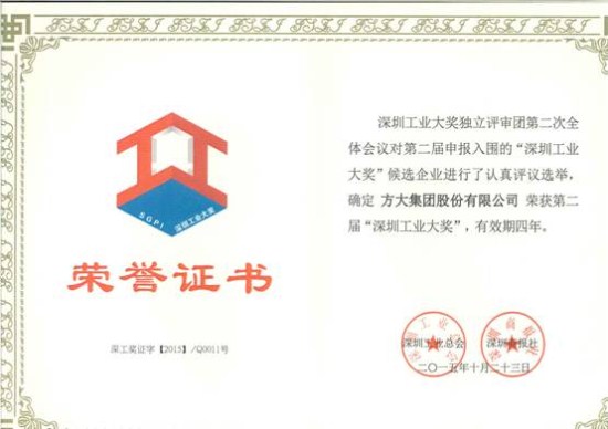 方大集團榮獲第二屆深圳工業大獎企業獎(證書)