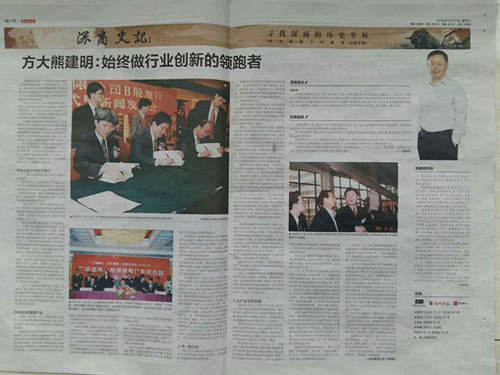 2016年12月7日,《深圳晚報(bào)》深商史記欄目以兩個(gè)整版超大篇幅報(bào)道方大集團(tuán)股份有限公司董事長熊建明的風(fēng)雨創(chuàng)業(yè)歷程,講述了熊建明董事長20多年來在建筑新材料、節(jié)能環(huán)保等行業(yè)領(lǐng)域的奮斗故事,記錄了他把方大集團(tuán)從3萬元起家、市場為零的小公司,培育成領(lǐng)先國內(nèi)同行、坐擁多項(xiàng)技術(shù)成就獎的領(lǐng)袖級企業(yè)的傳奇經(jīng)歷,淋漓盡致地展現(xiàn)了熊建明董事長“敢為天下先”的奮斗姿態(tài)和樸實(shí)的創(chuàng)業(yè)情懷。