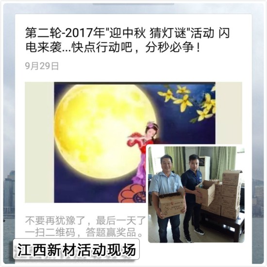 在方大集團(tuán)江西公司,9月28日、29日舉行了一次別開生面的“迎中秋猜燈謎”線上活動。為了讓公司員工感受到節(jié)日濃厚的氣氛,同時(shí)又能搭建企業(yè)文化交流的橋梁,此次活動由傳統(tǒng)猜燈謎改為微信猜燈謎方式進(jìn)行。員工們通過關(guān)注公司微信公眾號后,即可在線參與解答猜燈謎的活動。通過這次“迎中秋猜燈謎”活動,極大地激發(fā)了員工們關(guān)注公司微信公眾平臺的激情,也為員工們留下了一段難忘的節(jié)日回憶。