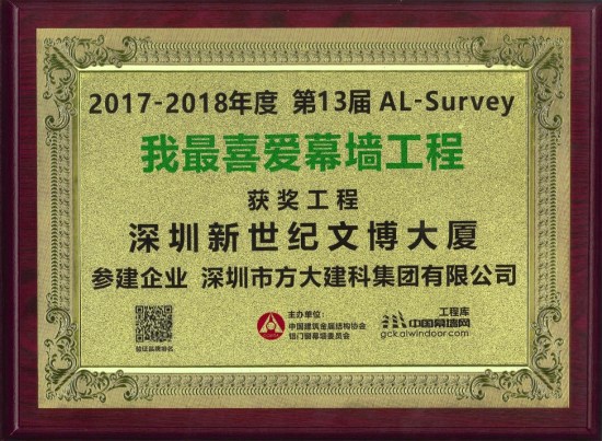 第13屆“我最喜愛幕墻工程”評選活動由中國建筑金屬結構協會鋁門窗幕墻委員會、中國幕墻網聯合發起,經廣大網友投票及專家評審,方大建科承建幕墻工程的深圳新世紀文博大廈最終以216740的高票和專家五星評價獲獎。