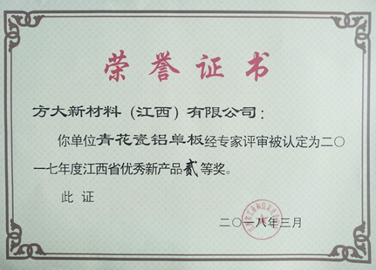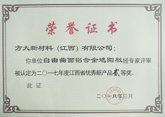 近日,江西省工信委在全省工業和信息化技術創新工作會公布了2017年度優秀新產品獲獎名單,方大集團全資子公司方大新材料(江西)有限公司的“青花瓷鋁單板”、“自由曲面鋁合金遮陽板”兩項新產品獲得了2017年江西省優秀新產品二等獎。